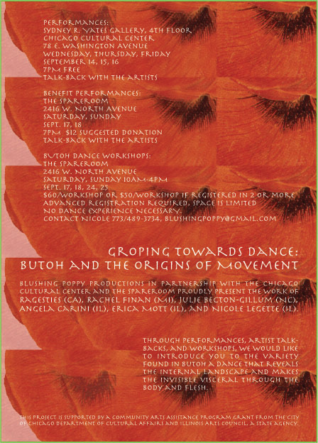 Groping Towards Dance: Butoh and the Origins of Movement, curated by Nicole LeGette, showcased emerging butoh artists from across the country. This event was presented by blushing poppy productions in partnership with The Chicago Cultural Center and the Spareroom.